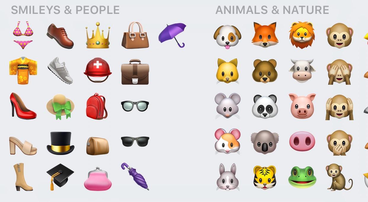 As for animals, there's now a fox face, as well as a long list of other animals. If you've ever wanted to include a gorilla, butterfly, deer, rhinoceros, bat, eagle, duck, owl, lizard, shark, shrimp, or squid in your iMessage conversation, you'll want to get on iOS 10.2 asap. Your conversations about famed gorilla Harambe will never be the same.