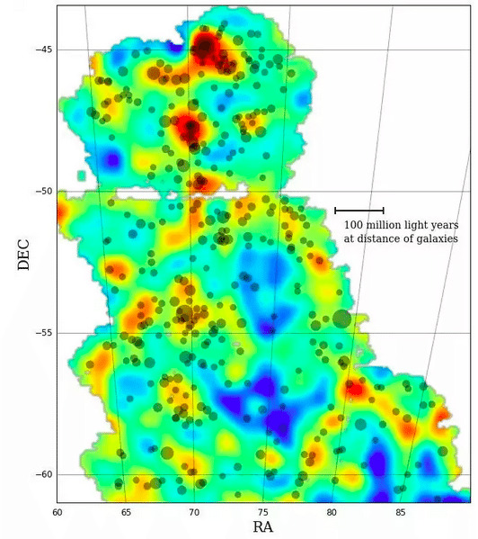The aforementioned camera was made by and tested at the Department of Energy's Fermi National Accelerator Lab, and it is now mounted on the Victor M. Blanco telescope in Chile. The processing of the massive amounts of data, however, is done at the National Center for Supercomputing Applications in Illinois. Though the map shows a large area, it only covers 3% of the eventual area the Dark Energy Survey will document over the next half decade.