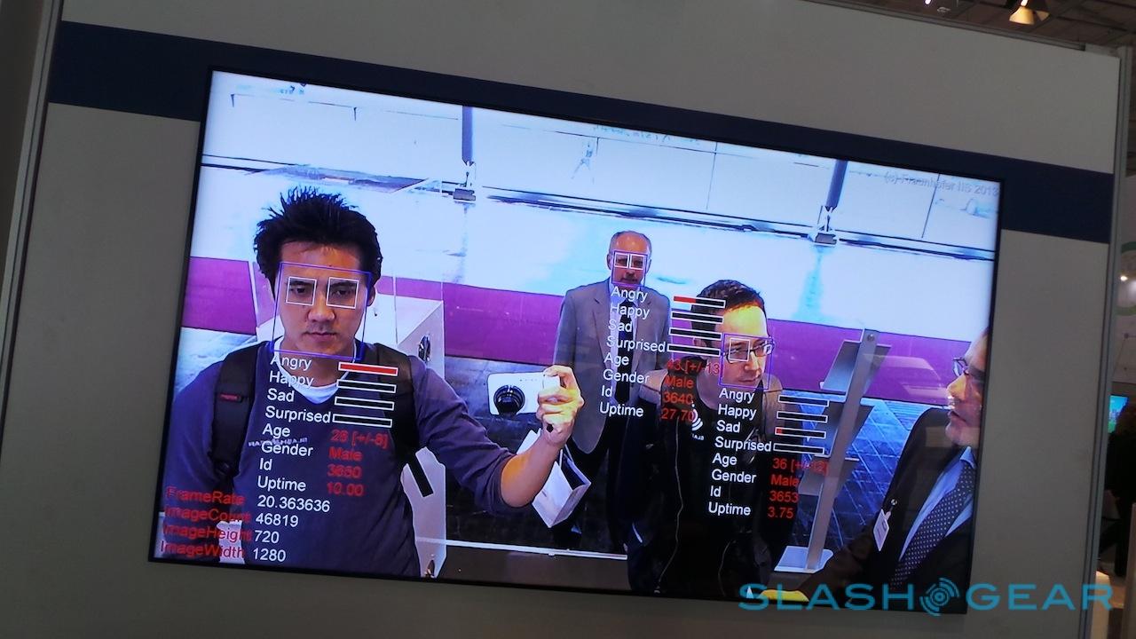 In Fraunhofer's demo, a computer running SHORE was able to identify and classify multiple people walking in and out of frame, with the results of the analysis floated over each person on a wall display. The measurements happen almost instantaneously – the research institute says SHORE can identify a face at 107.5fps if it's directly facing the camera, while full analysis including facial expression detection is at 45.5fps – and the system can handle head tilts of +/- 60-degrees and head rotation of +/- 90-degrees.