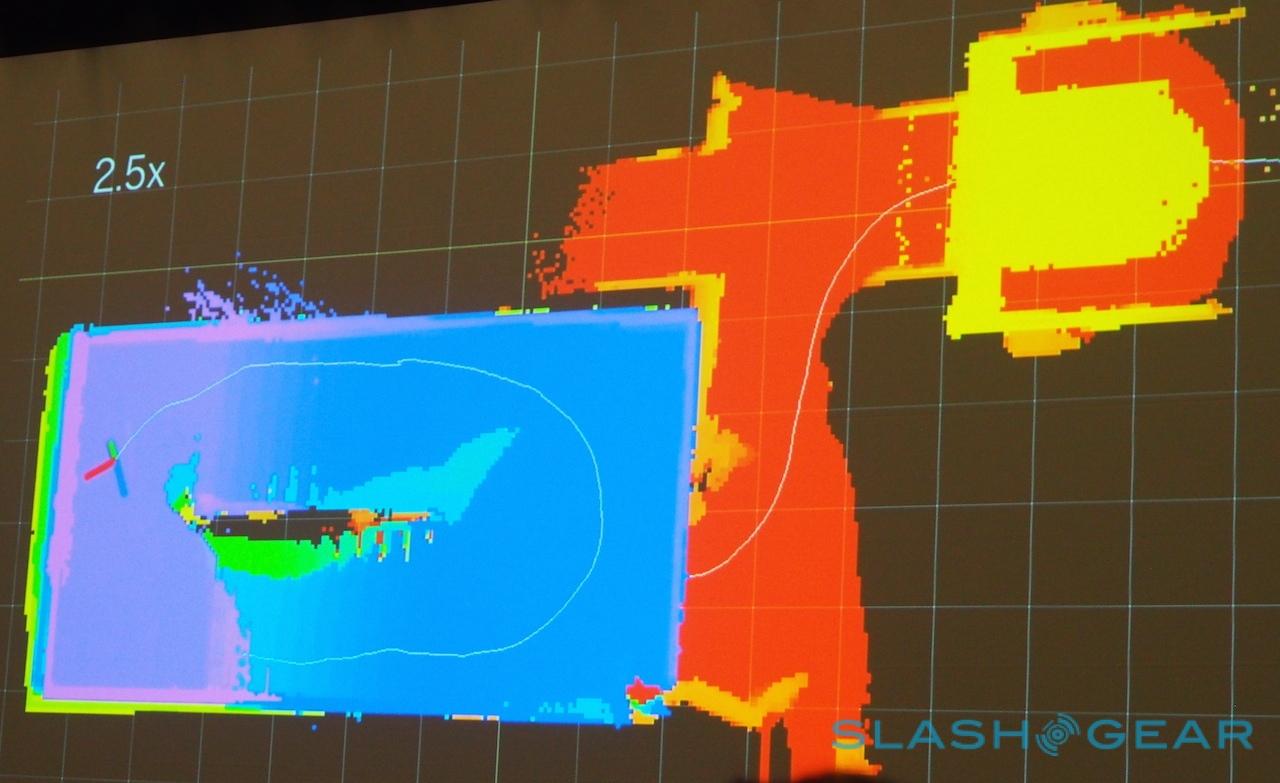 Those senses mimic how the human eye works, both giving broad peripheral vision and a more detailed, central section of foveal vision. The depth sensor actually cycles on and off during use, to help reduce battery consumption and processing load, though Lee said Google is still assessing different depth-sensing technologies.
