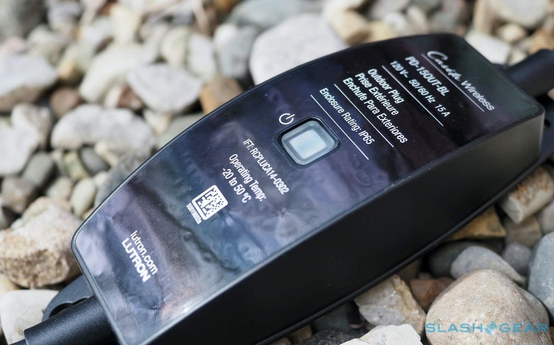 The front gets a single button for power: press it once, the connected device turns on, and a green LED lights up to show current status. Of course, the whole point is that you don't have to go outside. There, depending on what existing Caseta hardware you have, the experience varies.
