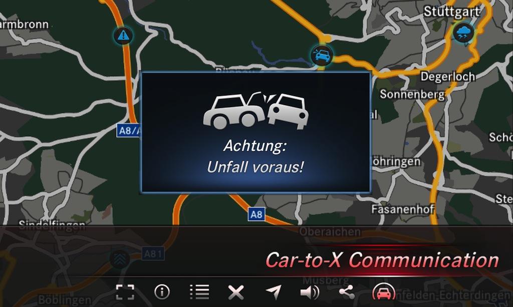 Mercedes aims to have its cars talking with each other and warning drivers of potential hazards ahead by the end of the year, with the company the first to deliver Car-to-X wireless to its range. Described as giving drivers the ability to "see around corners", Car-to-X allows vehicles to send out localized warnings and notifications about crashes, broken-down vehicles, police cars, animals in the road, and other potential perils, flashing up an alert on any other suitably-equipped car nearby.