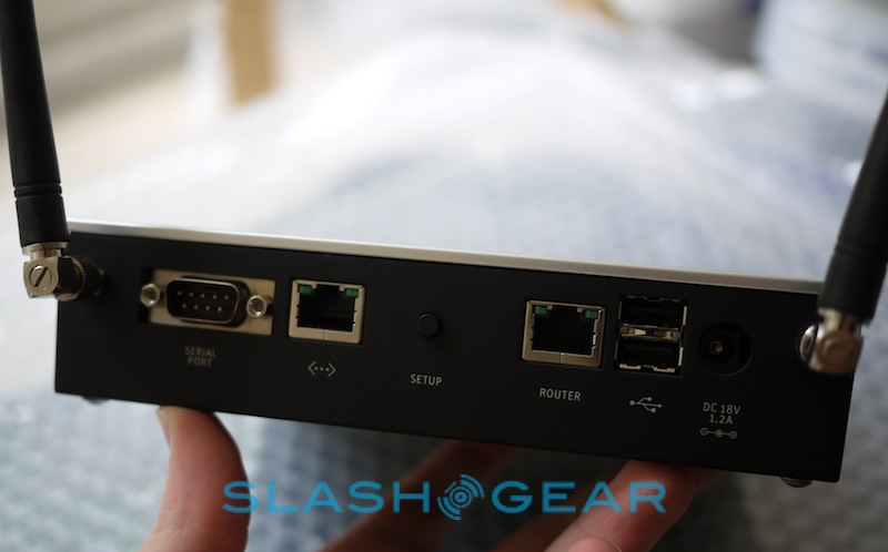The Raumfeld Base is the heart of the system, a router-sized black and silver box with twin WiFi antenna and three LEDs. Not only is it responsible for creating the WiFi b/g network that each Raumfeld component links to – unlike Sonos, the German firm use regular WiFi rather than a proprietary mesh network – it has a 160GB hard-drive inside that can be used to serve up audio without your PC or Mac being switched on. On the back there are two ethernet ports – one for your router, another a simple pass-through – a serial port (for debugging), two USB 2.0 ports which can be used to add external hard-drives and thus boost storage, and a setup button (which we'll come back to).