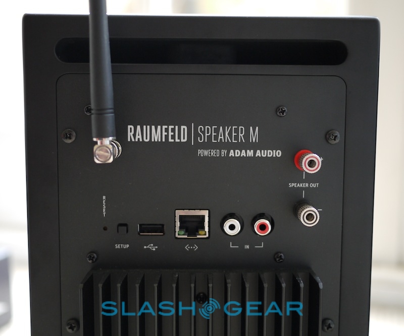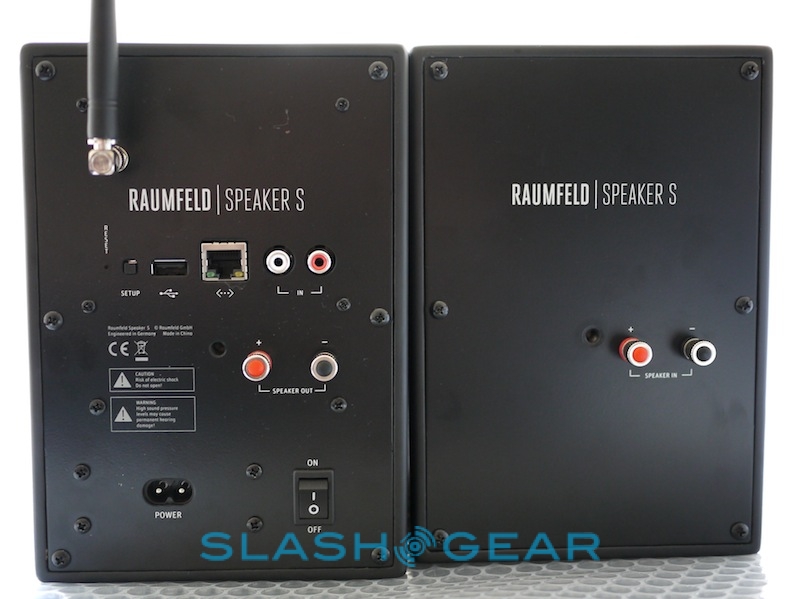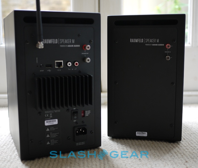 Finally, the Raumfeld Speakers, of which there are currently two sizes. Both the Raumfeld Speaker S and Speaker M systems integrate the networking and amplification into one of the units themselves: all you need is a single power connection (and wired ethernet if you're not using the WiFi) and you're running. Sonos' S5 is the closest comparison, though of course that bundles both left and right channels into the same housing, whereas with the Raumfelds you can stretch the soundstage as far as your room (and speaker cable) allows. Sonos will allow you to pair two S5's wirelessly and designate one to each stereo channel, but that's an expensive proposition.