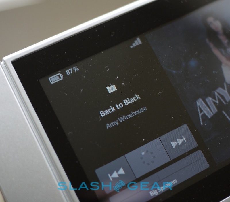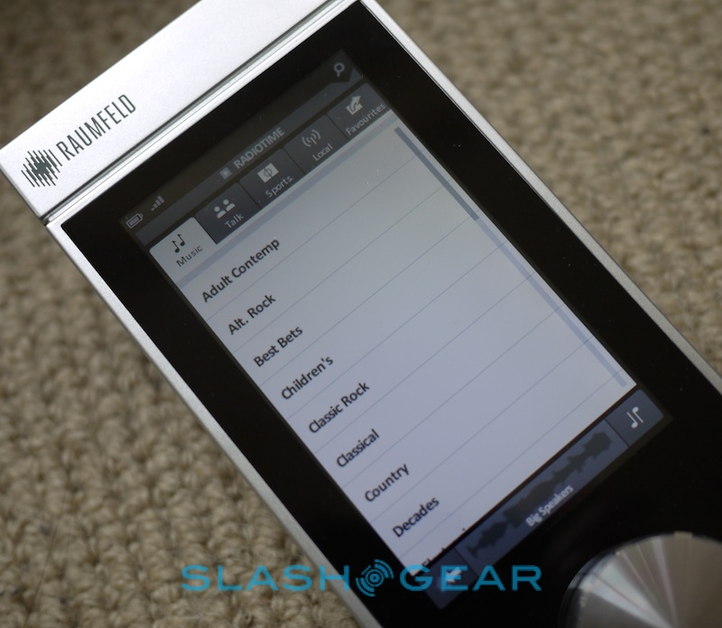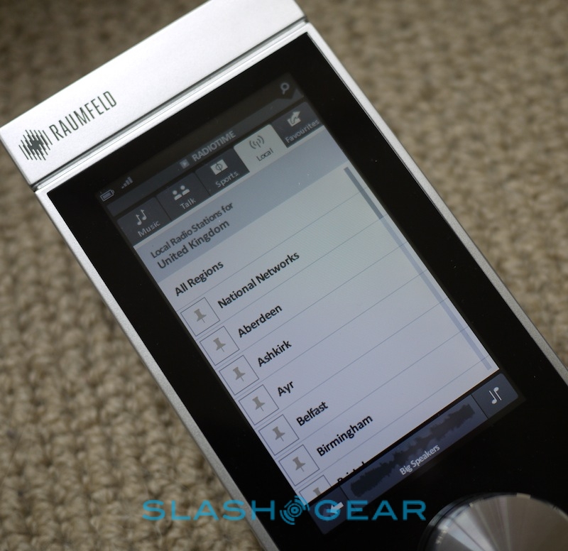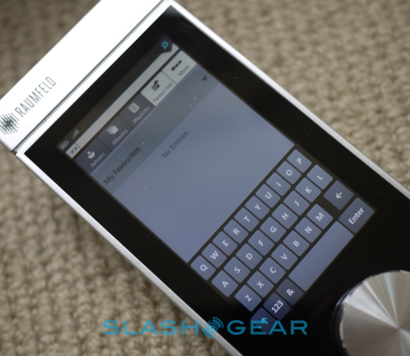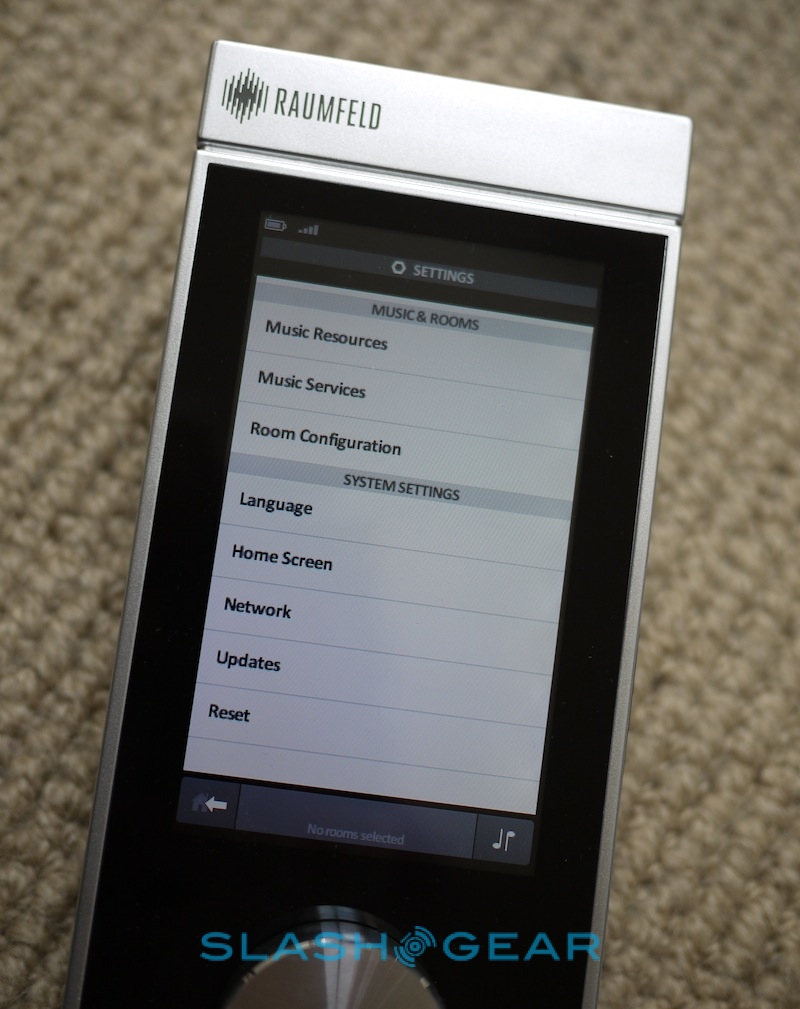 The Raumfeld Controller is a chunky, weighty touchscreen device with a capacitive panel and a large volume dial. Beyond the power button that's the only physical control; everything else is managed via the touchscreen. On the top, under hinged rubber flaps, are a USB port (for manual firmware updates) and a power connector; however the remote comes with a charging station that the Controller sits in horizontally. The display is a bright 480 x 272 resolution panel, while inside there's a motion sensor – which wakes the remote when picked up – and a WiFi b/g radio.