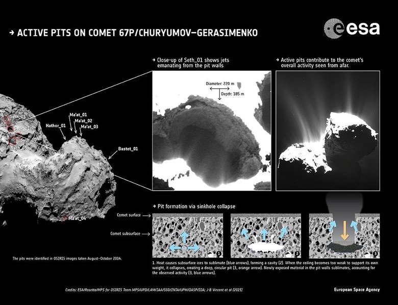 Rosetta continues its extended mission in capturing information on its nearby comet this week, finding massive sinkholes in the process. A number of these massive "cavities" have shown themselves in comet 67P/Churyumov-Gerasimenko. These holes appear as deep as 590 feet (180 meters) and as wide as 656 feet (200 meters) in diameter. While scientists are not certain why these pits are appearing, lead researcher Jean-Baptiste Vincent suggested that it could be because of the heat of the sun, this heat creating jets of surface-collapsing dust.