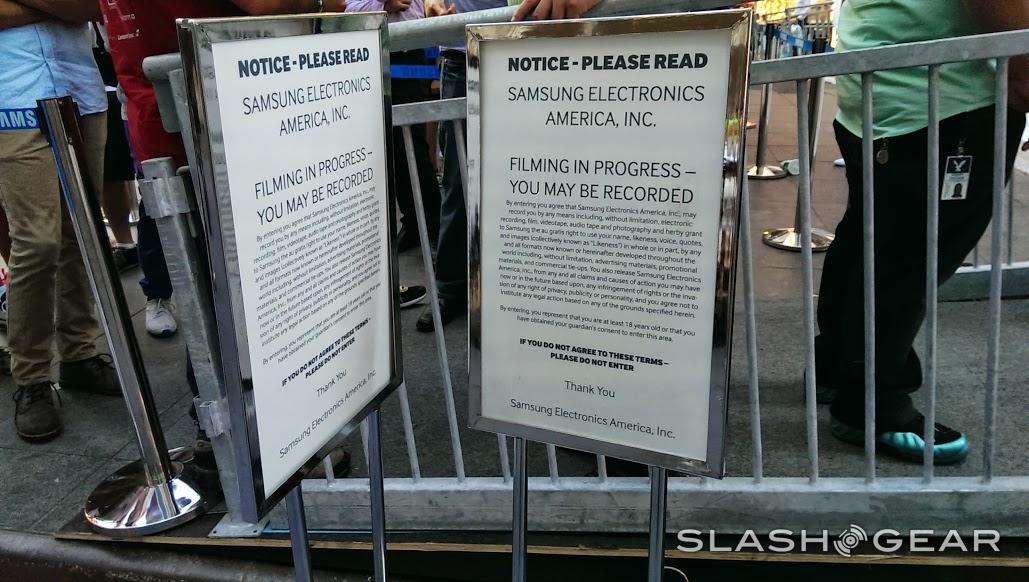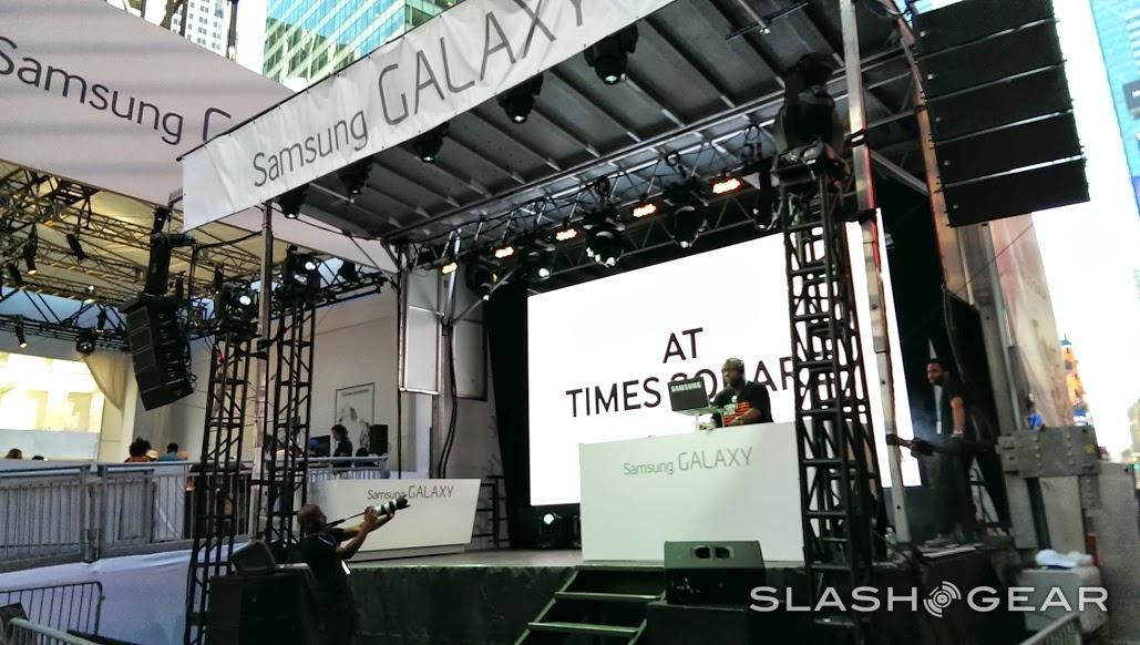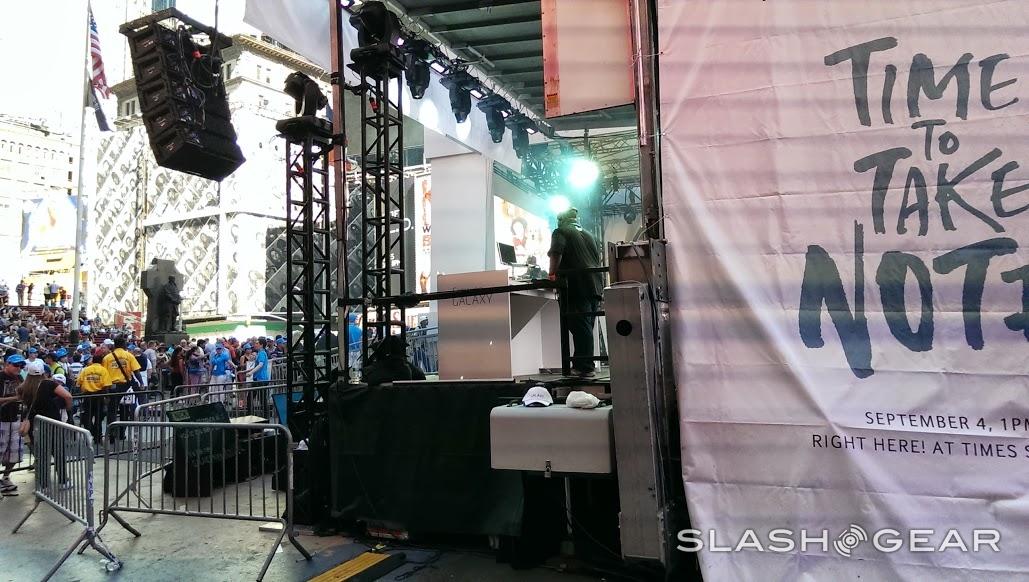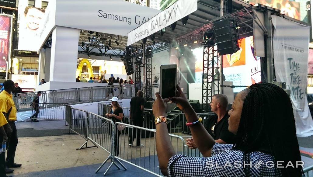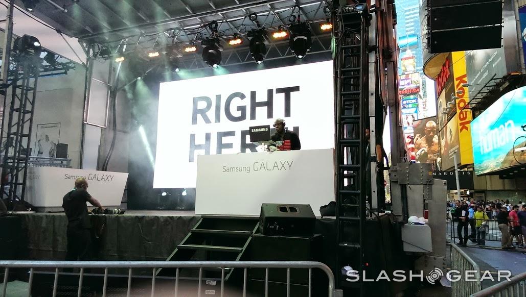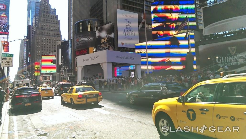 If you weren't one of the ravenous users waiting in line this week right in the center of the world's best-known culmination of streets, you're in luck: SlashGear has both a Galaxy Note 3 hands-on as well as a Galaxy Gear hands-on experience for your perusal. Those in New York yesterday afternoon were also treated to free hats, dancers, and a collection of massive billboards, both traditional and video animation in style.