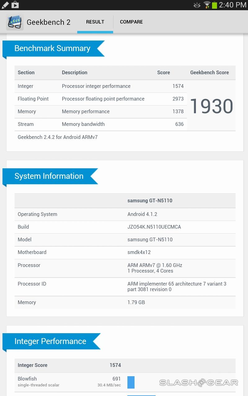 You'll find that this device busts out with its quad-core 1.6Ghz Exynos processor quite nicely – it's not going to top the newest smartphones on the market as it does have a bit more screen real-estate to work with, but it's certainly part of this current generation of multi-core beasts. Let us know in the comments below if there are any other tests you'd like us to run through other than the ones you see in the gallery above – we'd be glad to!