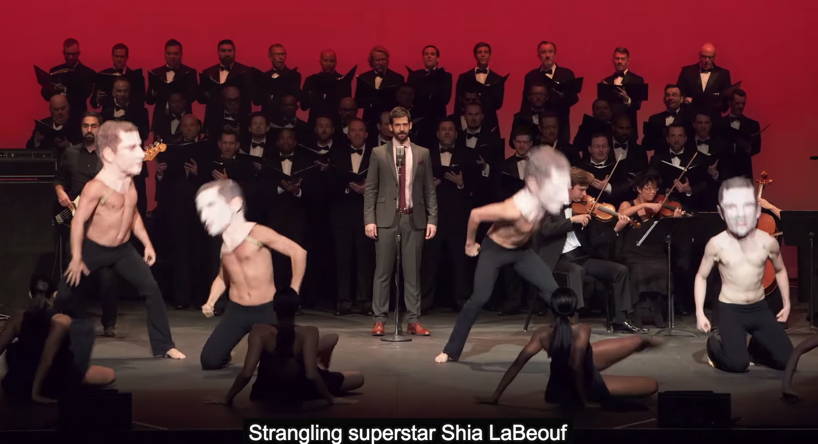 This particular rendition of "SHIA LABEOUF" as written by Rob Cantor is also performed by Rob Cantor with several helping choirs. There are three choirs here, to be exact.