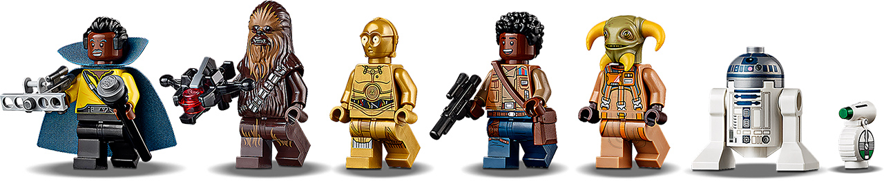 Kylo Ren's Shuttle is what you'd probably expect from such a ship – and the official description only reveals details about the hardware itself. Folding wings and spring-loaded shooters and such. The Millennium Falcon, is similar, giving us a list of minifigures that'll take part in the set: Finn, Chewbacca, Lando Calrissian, Boolio, C-3PO, R2-D2 and D-O.