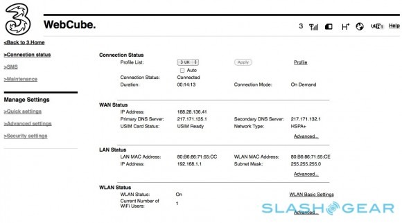 Inside the Huawei-made device there's a HSPA+ radio supporting up to 21.6 Mbit/s downloads and up to 5.76 Mbit/s uploads, network depending, along with a WiFi b/g/n router supporting up to five WiFi connections at any one time. 3G signal strength is shown via blue LEDs on the top panel.