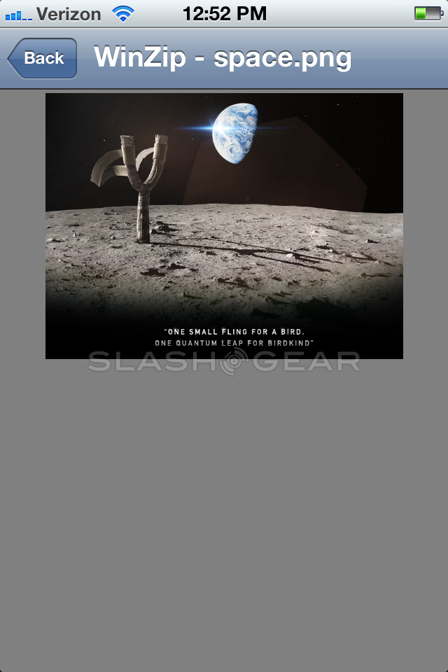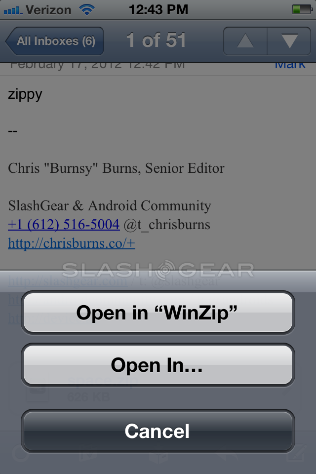 It's time to make the opening of ZIP files easy, finally, on the the iOS platform for iPhone, iPad, and iPod Touch. This application takes files that have been compressed with the .ZIP file extension and opens them up for you – but more than that, it's able to show you what's inside without you having to run the files in other applications. In the example we've got here, a simple image is sent in a .ZIP file through email, opened in the basic Mail app, and the image is previewed inside WinZip.