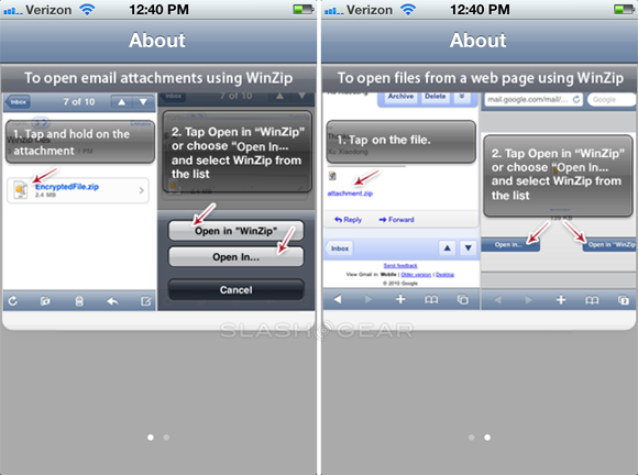 When you open WinZip for the first time, you get a set of instructions that you'll see below this paragraph. Because WinZip is an application that's supposed to work with you as an almost invisible tool, it's not something that you have to open from its icon to work with. You can toss it in a folder and forget about it, in fact, as the way you'll be working with it is through your basic pop-up menus anywhere you've got a ZIP file on your smart device.