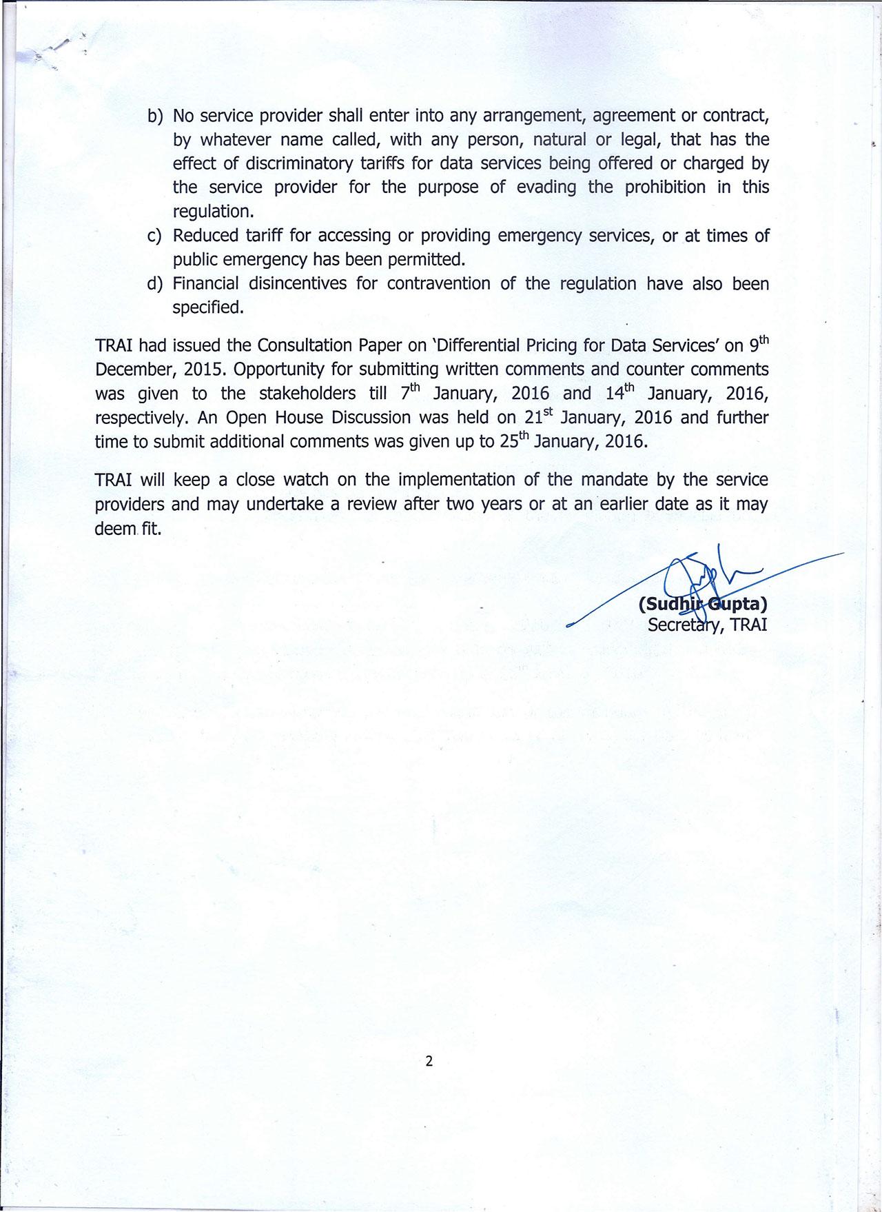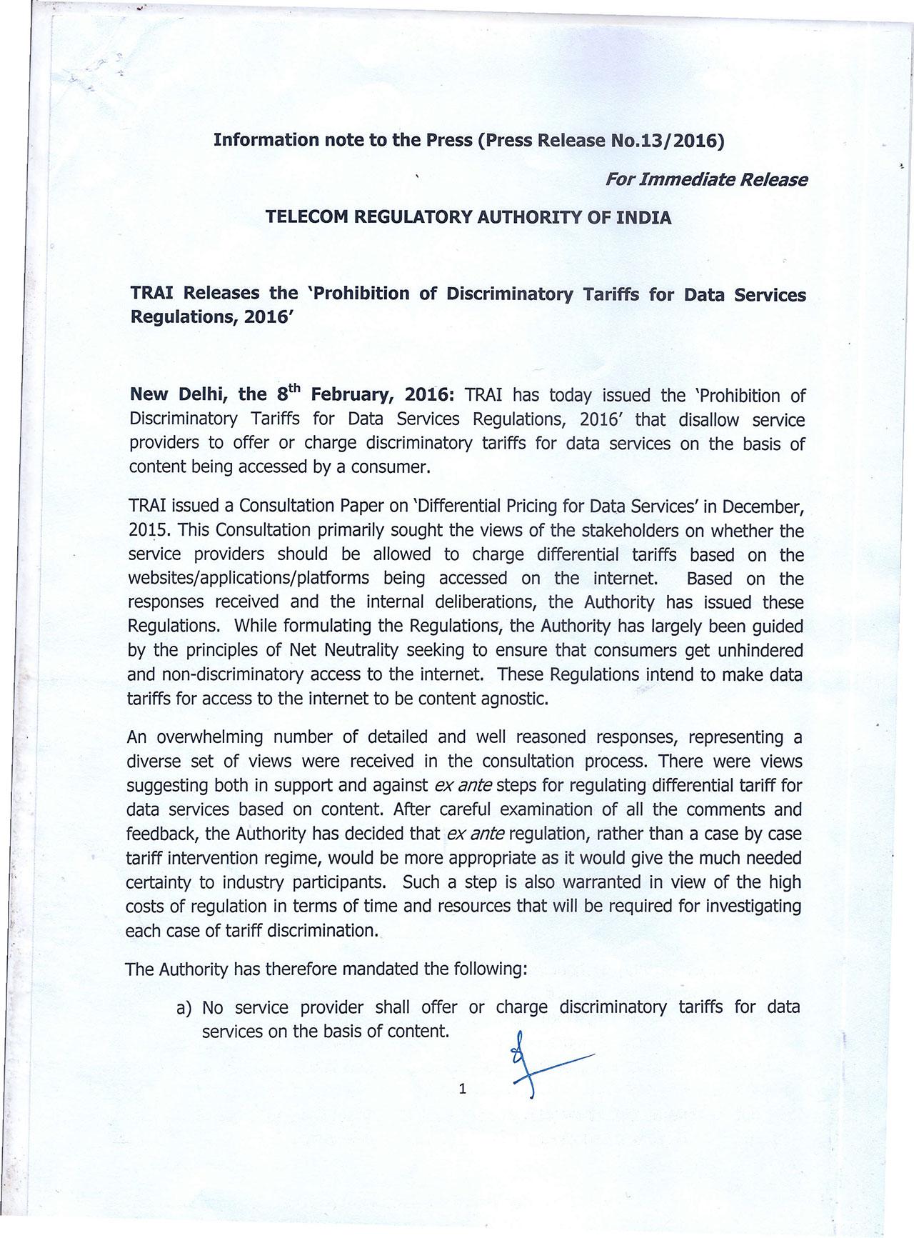 India's new law will "disallow service providers to offer or charge discriminatory tariffs for data services on the basis if content being accessed by a consumer."