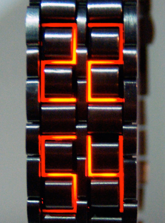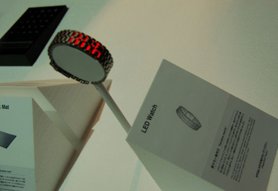 Studio 100% have been showing off this new LED watch at Tokyo Design Week 2008, with hidden LEDs that shine through the gunmetal links of the bracelet. It manages to look both modern and retro at the same time, probably because of the nixie tube orange color.