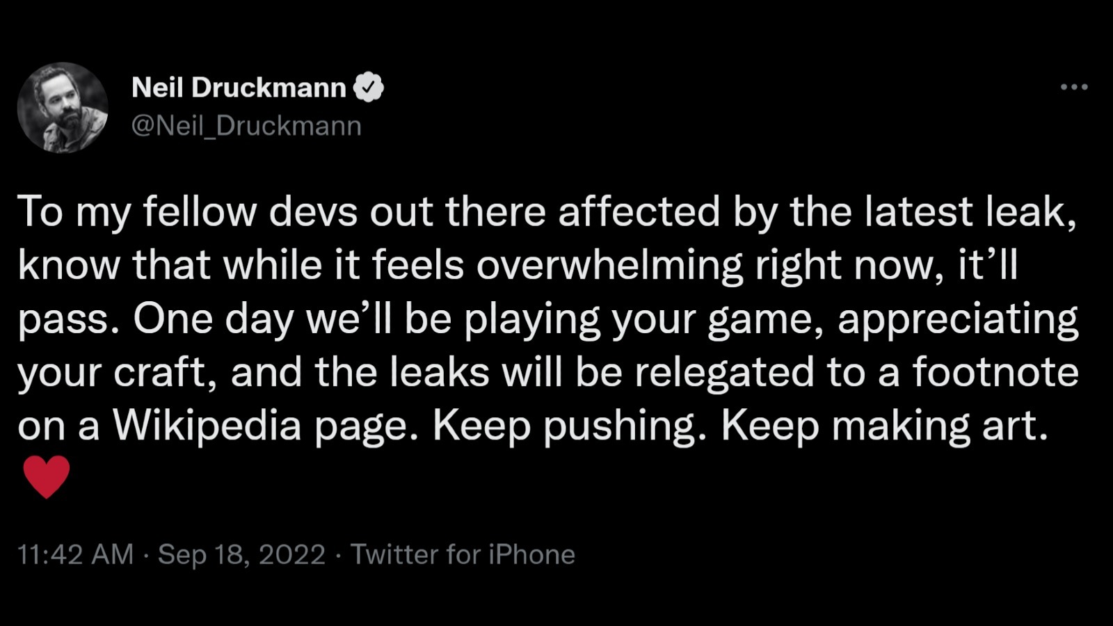 Naughty Dog's Neil Druckmann, director of the massively popular game series "The Last of Us," took to Twitter soon after the "GTA 6" leak to express a heartful message about the matter, addressing those in the video game industry specifically. He offers the developers who were impacted by this leak the reassurance that even if the current happenings feel "overwhelming," they should keep in mind that "it'll pass." Not only that, but Druckmann reminds the developers that the leak may be a big deal right now, but it won't be too long before the game is released and fans will get to experience the final product for themselves, leaving the premature video clips and other materials behind for good.