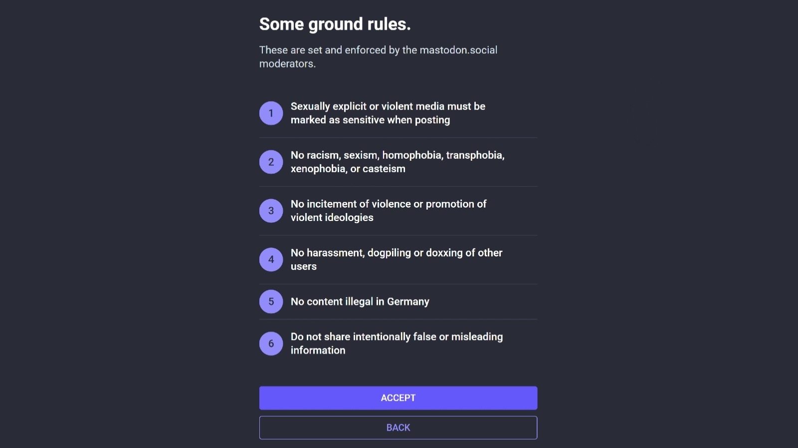 When you go to create your account, you'll see the rules enforced by that particular server — and as mentioned, these will vary between instances, so that what is acceptable on one node may not be acceptable on another. Using mastodon.social as an example, the instance forbids racism, sexism, homophobia, transphobia, and similar, doesn't allow its members to promote or call for violence, bans misinformation, and other things you'd commonly find on a mainstream social media platform.