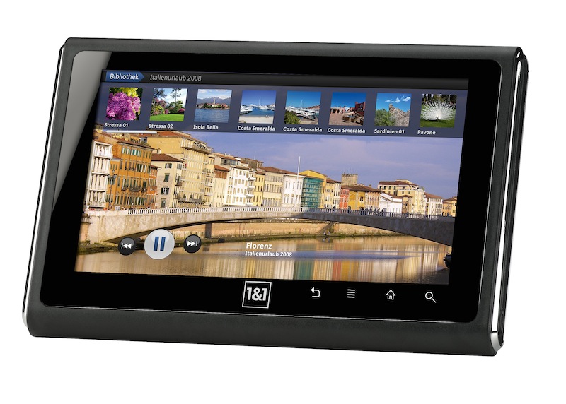 German internet provider 1&1 has outed a new Android-based tablet for its home subscribers, a 7-inch touchscreen slate with WiFi b/g/n and the ability to use a USB 3G modem. The 1&1 SmartPad will come preconfigured with various Android apps, including a digital photo frame viewer, ebook reader and weather widgets, and be sold alongside an optional dock with a remote control and subwoofer.