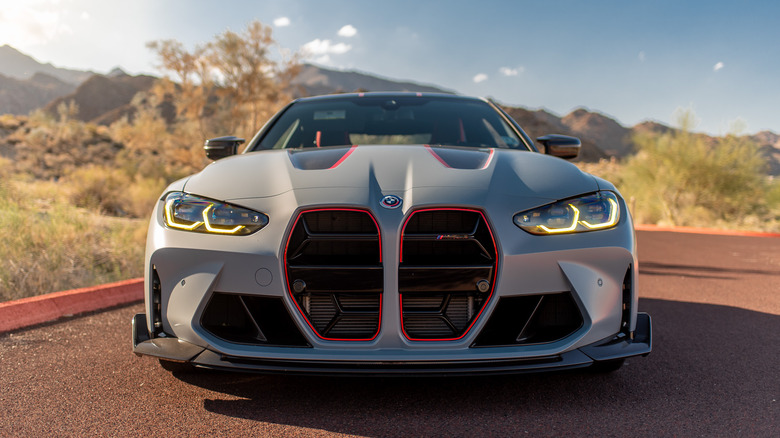 A track car, however, cannot just be fast—it needs to let everyone know it is fast. So the other obvious way the M4 CSL informs everyone in a 100-foot radius that it's no regular M4 is, of course, the styling. The CSL takes the already-divisive massive kidneys of the lower M4s, outlines them with a bright-red sharpie, and rips out all the mesh so that all that's left is a gaping maw of intercooler and intake. The double-bulged hood, the GT4-car-inspired yellow running lights, and the massive carbon lip all work are dripping with sculpted machismo; while it might not be to everyone's taste, there's no disputing the styling makes an ACR Viper look low-T in comparison.