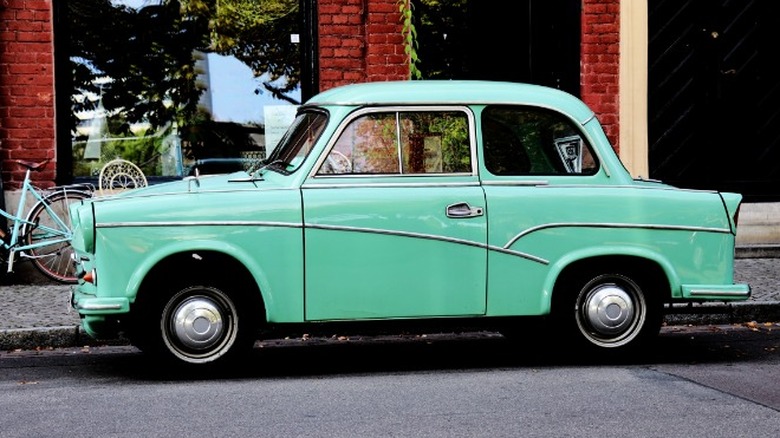The Trabant was powered by a two-stroke, two-cylinder engine that produced a mighty 18 horsepower sent through a four-speed transmission (via Motorpedia). Manufacturing costs were spared in every part of this car from its basic engine design to its lack of accessories. The body is manufactured from Duroplast, a type of plastic made from resin and recycled cotton, both for its low cost and due to lack of raw materials from Cold War-era economic isolation. The unintended benefit of the body construction is that it does not rust, but that is where the positive qualities end.