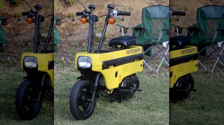 First going on sale in 1981, according to Honda, the Motocompo was built from the ground up to be as compact as physically possible; it was capable of folding up and fitting into the trunk of the Honda City. When folded up, the seat and handlebars disappear into the bike's tiny rectangular frame. Per Silo Drome, the entire bike measures 46.7 inches long, 9.4 inches wide, and 21.3 inches tall, allowing the entire bike to fit within the 49.8-inch wheelbase of a Honda Ruckus. A Top Gear segment demonstrated that it only took a few minutes to fold up and store away.