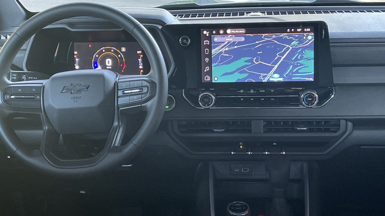 These thoughtful touches carry over inside, for the most part. We love the giant water bottle holders in the doors, the wide armrest that accommodates both front occupants, the easy-reach controls, and the great vision to the front and sides. In the Z71, the textured upholstery on the front of the dash with contrast trim dresses up the inevitable textured plastic across the dash top and sides; the Trail Boss we tested was kind of bland inside, though Chevy says that's deliberate. Even when the fabric is dull, the tech-heavy interior feels fresh and modern, with a crisp 11.3-inch infotainment display and tons of features like off-road performance tracking, various camera displays, and towing assists.