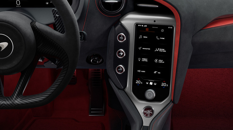 Another new button gives the nose lift a dedicated shortcut, with the useful front raise taking place in four seconds, versus 10 seconds for the 720S. The rear and surround view cameras are higher resolution, while in the center console there's a new, more detailed 8-inch optically-bonded touchscreen. McLaren's latest infotainment system adds Apple CarPlay support, and there are USB-C and USB-A ports with fast charging, plus a more powerful amp for the optional Bowers & Wilkins audio system.