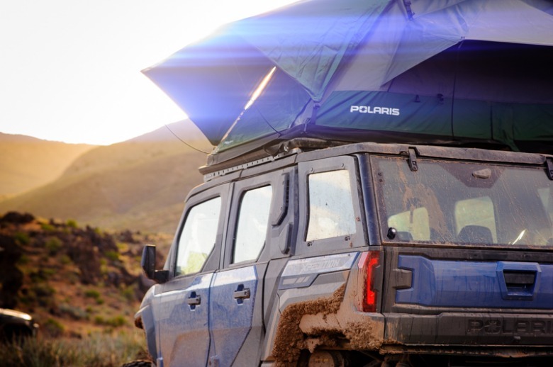 After completing the 108-mile first leg of the journey, my body was exhausted. Luckily, I had a nice soft roof to sleep on in order to rejuvenate myself. The process of unfolding the Xpedition's roof tent looked complicated, and I didn't have an instruction manual. I enlisted some Polaris reps to do the brunt of the work, and they had to crawl up and down the vehicle in order to turn the canvas box into something tent-shaped.