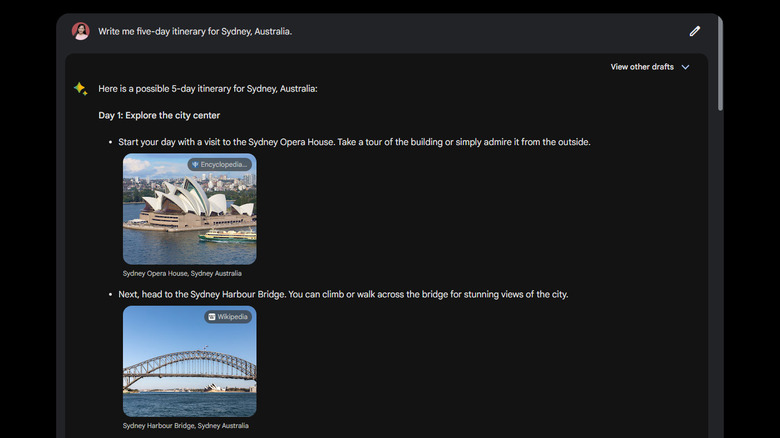 With Google Bard, however, you automatically get three responses (called "drafts") with each prompt. You won't have to regenerate a new response over and over again as you immediately have three answers you can choose from. If you can't find what you're looking for in these first three responses, you can still regenerate new drafts (each regeneration offers three drafts, too). However, while this is a faster way to get the answers you need, a downside of this feature is that you can't go back to the previously created drafts once you regenerate a new set.