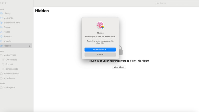 However, you can see them again if you go to the app's display menu, hover over View, and select Show Hidden Photo Album. This will cause the album to appear, but clicking on it will prompt you to either provide your Touch ID or your computer's password.