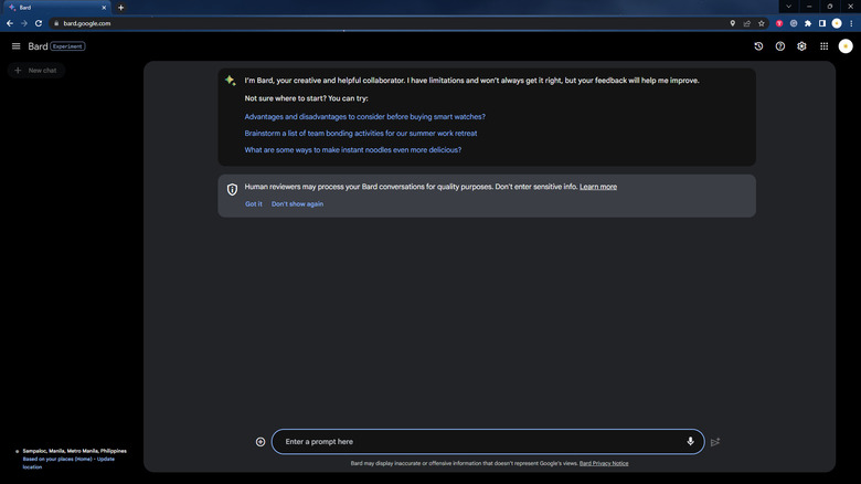 - (Optional) To get more accurate responses to location-related queries, click on Update location in the bottom left of the homepage to give Bard access to your location. Then, select Allow in the pop-up to confirm.