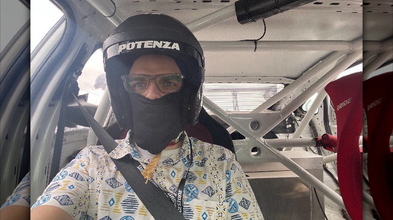 After several laps around the track, I was strapped into the passenger seat of the next car Bridgestone picked for the showcase, a Honda Civic Si Race Car. And I'm not calling it a race car because it looks fast or sounded mean (it did), it's a literal race car with a roll cage, a fuel cell in the back, and nothing that could even be remotely described as an "interior." It was made right from the factory by Honda's Performance Division in Ohio to melt tires on the track and scare automotive writers. It succeeded at both.