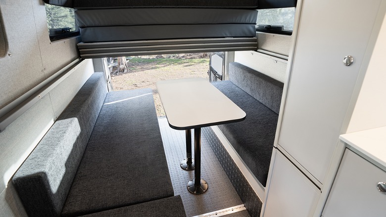 The interior height of the cabin is 6 feet, 8 inches, so most will be able to comfortably walk around at full height. It has a seating area at the back along with a television, and the seating area turns into a bed when it's time to get some sleep. It also has a kitchenette on one side and a bathroom on the other.