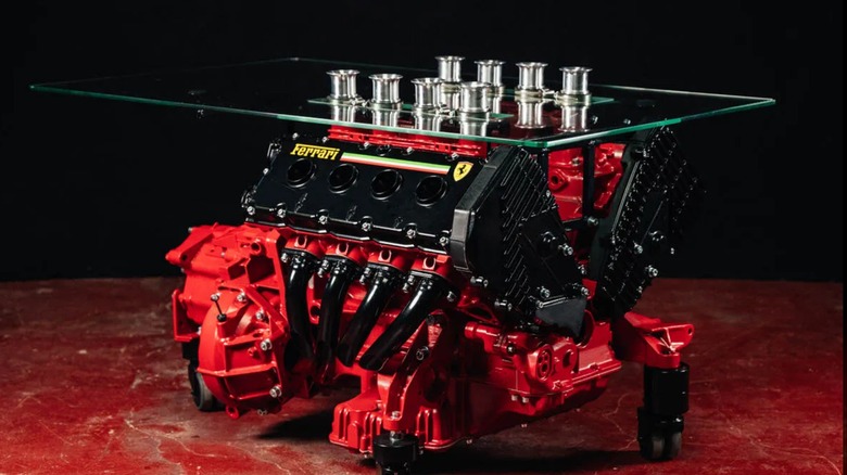 This practice is most notable for being the basis of the table used on the Top Gear set for many seasons, which is a glass top sitting on a V12 engine block. While that seems an ideal piece of decor for a motoring show, the trend is much more popular than you may think. Searches online for engine tables turn up many websites devoted to converting old engine blocks into tables, with many more listed on eBay and Etsy. As recently as August 2023, Bring a Trailer auctioned off a table made from a Ferrari F10-5 V8. It had the engine and transaxle as the base, complete with cylinder heads and valve covers, with the air horns for the intake sitting on top of the glass as if the intake was going through it. That auction ended at $18,500, meaning some Ferrari lover must have really wanted that table.