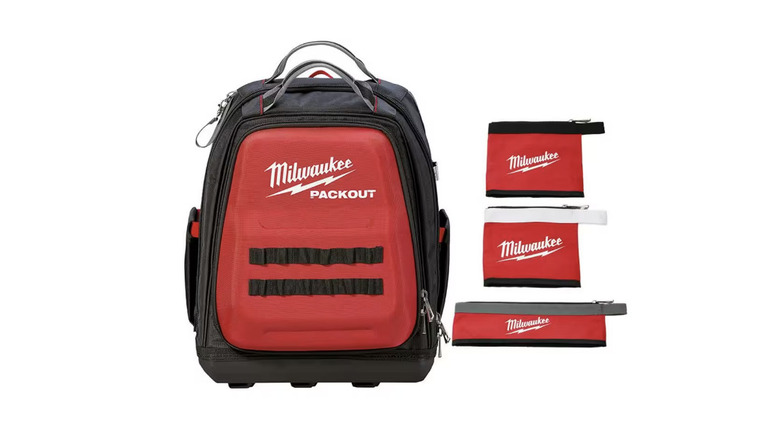 A small but versatile tool storage package is the 15-inch Packout backpack, which comes with three zippered tool pouches for $148.98 from Home Depot. The backpack is 15 inches wide, 20 inches tall, and 11.5 inches deep. The three pouches are made of heavy-duty #10 canvas and are 14, 8, and 6 inches long. They have different colored bands at the top for easy identification and water-resistant stand-up bases.