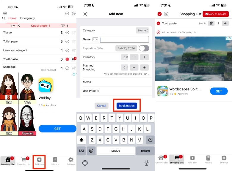 Afterward, the item name will appear under its respective Category on the homepage. Once each item is fully consumed, all you have to do is tap the minus (-) button next to it. When your inventory for an item hits zero, the Inventory Note app will add it to your shopping list. One caveat is that you can't attach any photos, so you'll need to add the brand name and quantity under the Memo section to avoid housemates purchasing the wrong item.