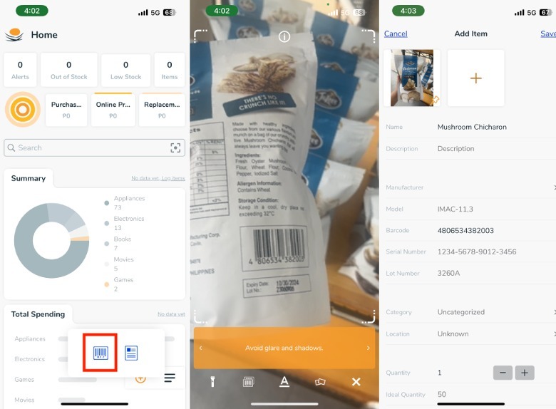 Using the camera, scan the barcode of the item you want to add to your inventory. You may need to move to a well-lighted location and move your phone for this to work.