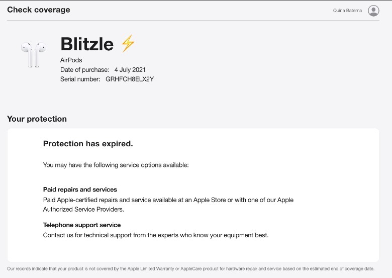 Once you click the device name, it will lead you to a page showing your AirPods protection details, including the date of purchase and serial number.