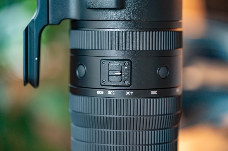 As expected on a lens like this, there are plenty of buttons and switches. These include an AF/MF switch, an on/off image stabilization switch, two customizable buttons, a 3-way focus limiter switch, and a switch that locks and unlocks the zoom function. Interestingly, this includes a middle mode which increases friction and slows down the zoom.