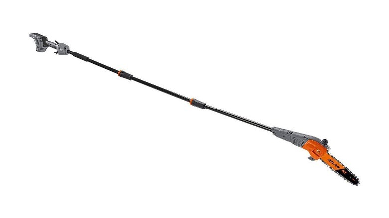 Atlas makes a 40V Cordless 10" Pole Saw which is sold at Harbor Freight. This is a 10" bar and chain battery-powered saw which comes fixed to a pole that starts at 6 ft. and can extend up to 9 ft., for a total potential overhead reach of 15 ft. It has an angled head with a built-in branch hook for easy pruning as well as an automatic oiler with a viewing window and a comfort forearm rest to help reduce fatigue. This tool can either run on Atlas' 40V or 80V batteries, giving you options for power output and making it easier to pair with batteries you may already have in your collection.