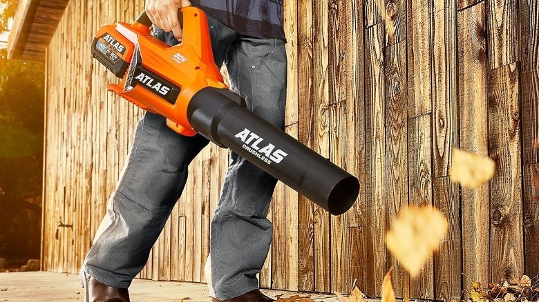 The Atlas 80V Brushless Cordless 150 MPH Blower is a great option. This is a 605 CFM blower with a brushless electric motor that is powered by 80V Atlas batteries. It has what Harbor Freight refers to as a "Turbo Nozzle," which is designed to increase airspeed so that the tool can remove heavier debris. It comes with several other nifty features as well, like an electric starter, a turbo button for when you need a little extra power, a cruise control lever to reduce fatigue, a variable speed trigger, and an onboard hanger for easy storage. Harbor Freight claims that this blower can clear half an acre on a single charge.