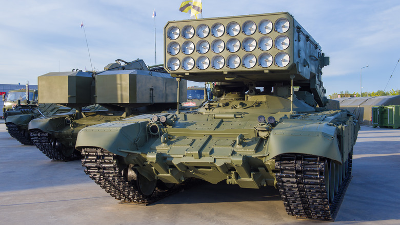 The tank itself is essentially a T-72 chassis that is heavy and strong enough to support the deadly rocket launchers that sit atop it. Uniquely, these launchers can fire thermobaric missiles, an incredibly powerful weapon that has proven controversial. Thermobaric explosives cause damage by creating a vacuum and blast wave that is capable of vaporizing people and completely destroying structures.