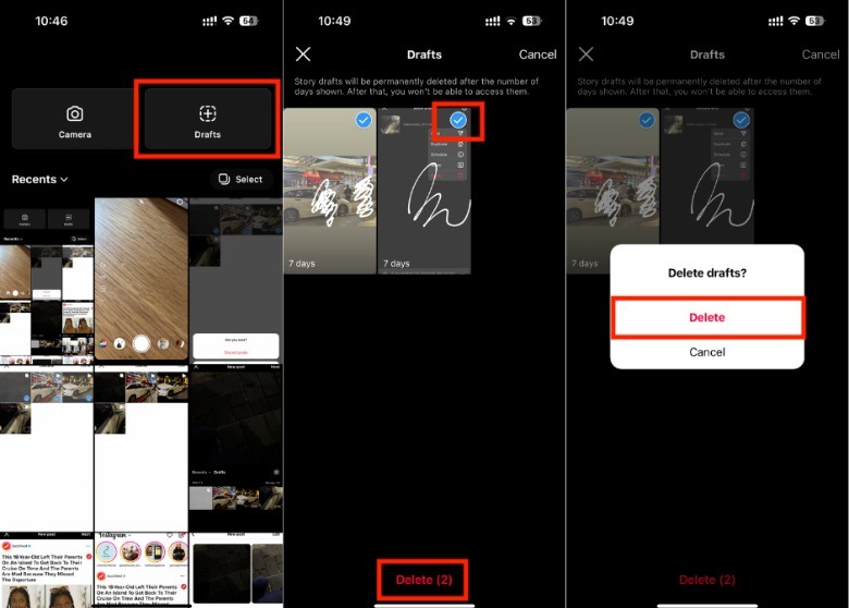 - To delete one Instagram Story draft, select the Story you want to delete.