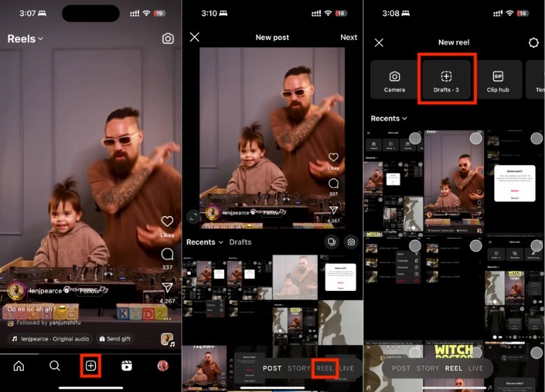 - Next to the Reel draft, tap the three dots icon and tap Delete.