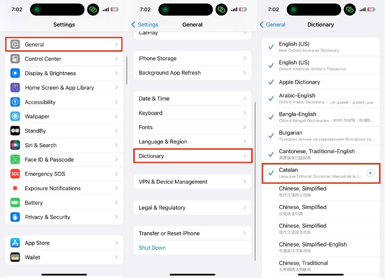 Tap General > Dictionary.