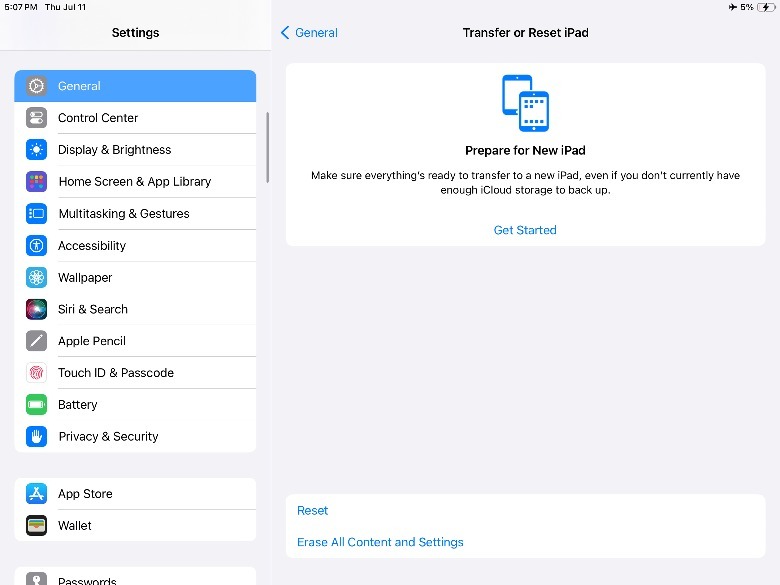If this doesn't work, you can attempt to do a standard restart on your iPad. To do this, simply press the top button (for iPads with Home Buttons) or press the top button plus any volume button (for iPads with Face ID) and drag the slider to turn it off. Afterward, simply press the top button until your iPad turns back on again. If there are no important files or documents on your iPad, you may also want to consider a hard factory reset by returning to the Transfer of Reset iPad section and selecting Erase All Content and Settings instead.