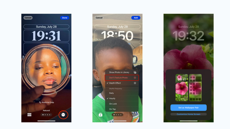 If you've chosen to use the suggested photos, you can remove those you don't like from the Preview page. Tap the three dots on the bottom right, select "Don't Feature Photo" then tap Done and the photo will be removed from the stack. If you missed this step and the errant picture has already shown up on your lock screen, press and hold it to pull up the customization menu, then follow the same steps above. The same method applies if you change your mind about a photo you manually selected. However, if you've set an album as your photo source, you'll have to remove a photo from that album to keep it from showing up on your lock screen.