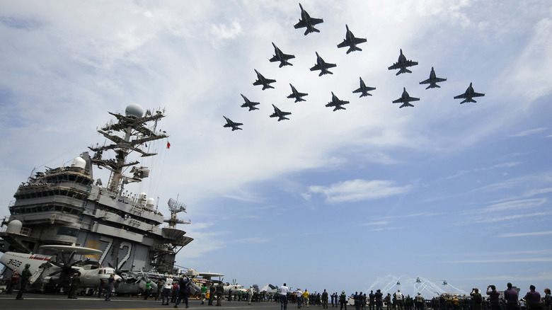 In addition to launching these aircraft into battle and other missions, the carrier needs to also defend itself. Fortunately for the crew, the USS Abraham Lincoln has plenty of armament, including four MK-38 Mod 2 25mm Machine Gun Systems, two RIM-116 Rolling Airframe Missile short-range surface-to-air missile launchers, two MK-57 Mod3 Sea Sparrow surface-to-air missile launchers, and two MK-15 20mm Phalanx CIWS, which are radar-guided, rapid-fire 20-millimeter Gatling guns capable of firing 75 rounds per second that are used for shooting down anti-ship missiles. Plus, the vessel is fitted with SLQ-25A Nixie torpedo countermeasures systems and an SLQ-32A(V)4 countermeasures suite that's designed to jam the radar of incoming guided missiles.