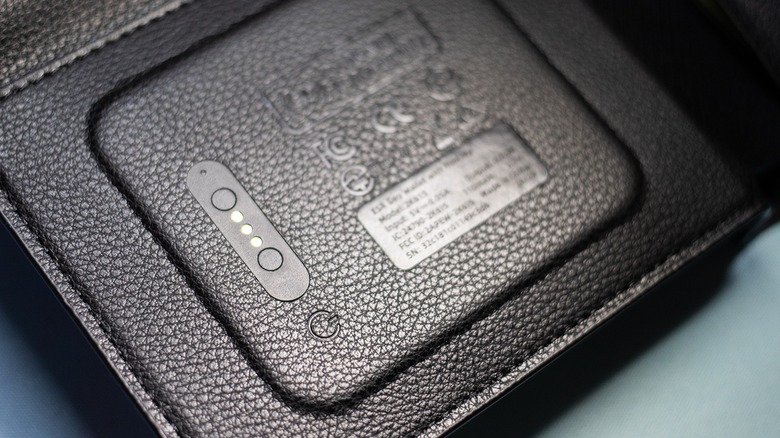 The wallet features a single small LED that will show you its power status while charging. It lights up orange as soon as you plug in the wallet, and then will turn green when the battery is full. I'm unsure how long it will take to charge, though, as I received the wallet fully charged and it will take too long for me to empty it. But it would suffice to say that it should take less than an hour, given that it seems like it has a pretty small battery.
