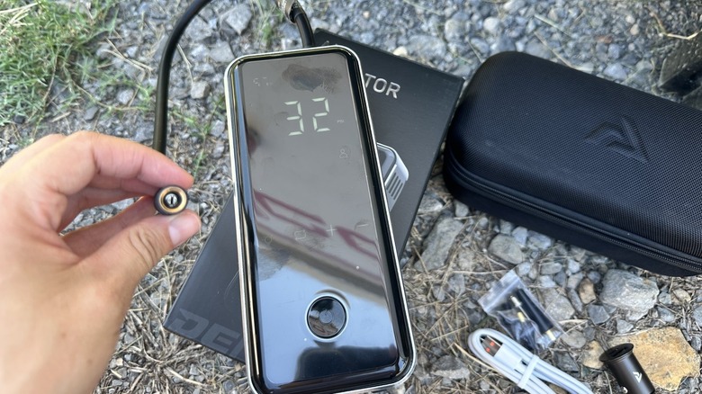 Right off the bat, I connected the air tub to the top of the inflator. The main tube comes with a Schrader valve, which is common on cars, motorcycles, and many mountain bikes, so I didn't need to attach valve accessories, which consist of a Presta valve as well as valves to inflate balls, balloons, and inflatable toys.